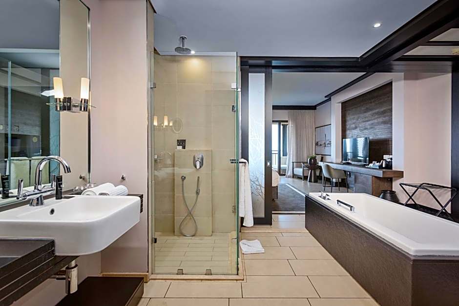 A kitchenette fitted with kitchenware, a microwave and an electric kettle is available for cooking and storing food. The spacious suite features air conditioning, a mini-bar, a terrace with sea views as well as a private bathroom boasting a bath. The unit has 1 bed.